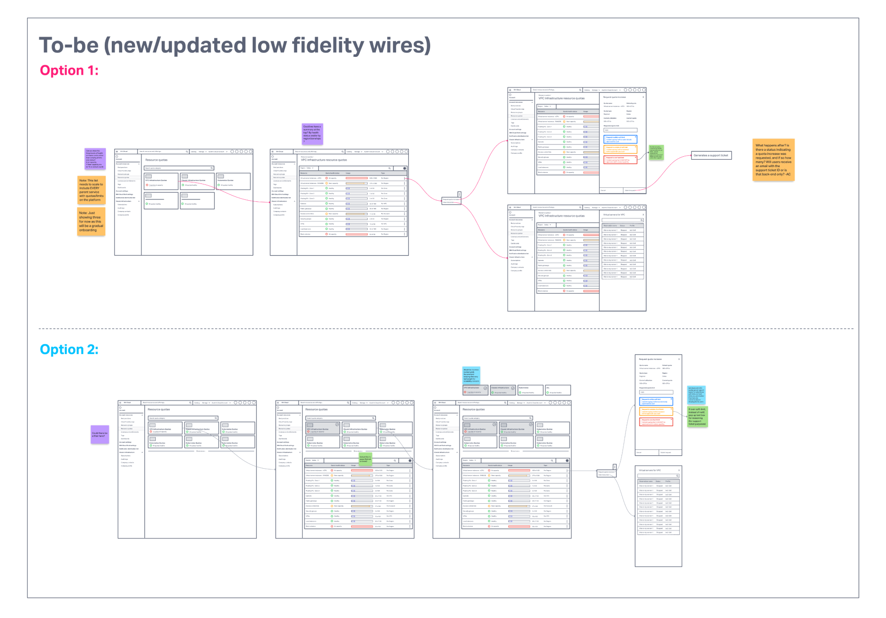 Low-fidelity wireframes were developed by synthesizing findings from competitive analysis, user interviews, and NPS feedback. These initial concepts were successfully validated during team critique sessions, confirming the core Information Architecture and streamlined the Resource Quotas Increase flows.